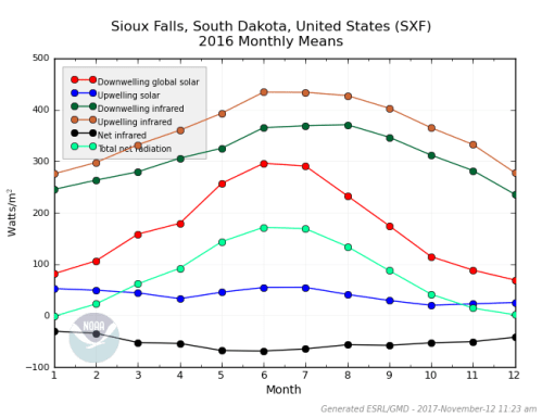 To get an idea of what happens at the surface, lets take a look at the data collected by the Surface Radiation Project. The Surface Radiation Budget Network (SURFRAD) was established in 1993 through the support of NOAA’s Office of Global Programs. The SURFRAD mission is clear: